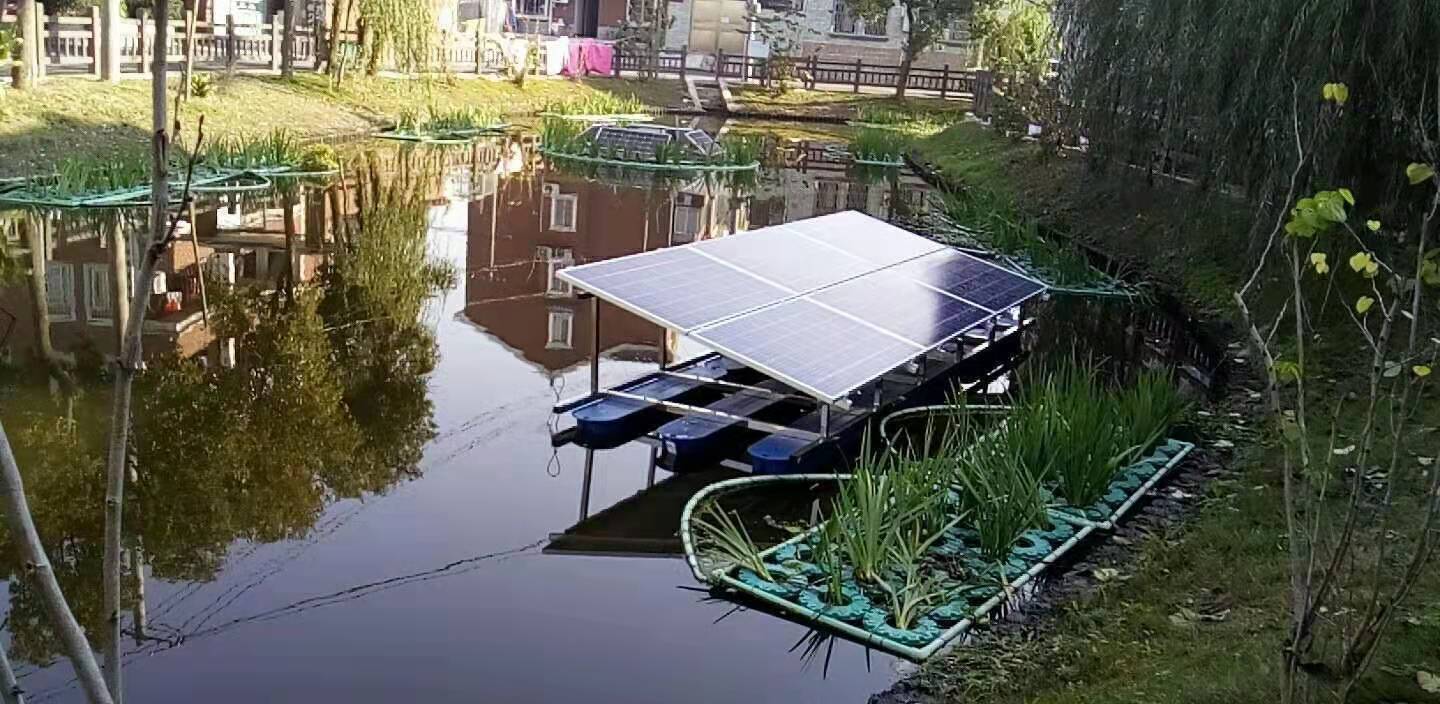 太陽(yáng)能曝氣機(jī),以太陽(yáng)能作為設(shè)備運(yùn)轉(zhuǎn)的直接動(dòng)力,設(shè)置獨(dú)特的旋切提拉曝氣葉輪,通過(guò)葉輪旋轉(zhuǎn)提升作用,將底部缺氧水轉(zhuǎn)移到水體表面與表層富氧水混合;表層富含水通過(guò)離心旋轉(zhuǎn)橫向水平擴(kuò)散、縱向進(jìn)入底層缺氧區(qū)。 由此實(shí)現(xiàn)水體解層、增氧和縱橫向循環(huán)交換三重功效,最大限度地將表層超飽和溶解氧水轉(zhuǎn)移到水體底層,增加底層水體溶解氧,消除自然分層,提高水體自凈能力。